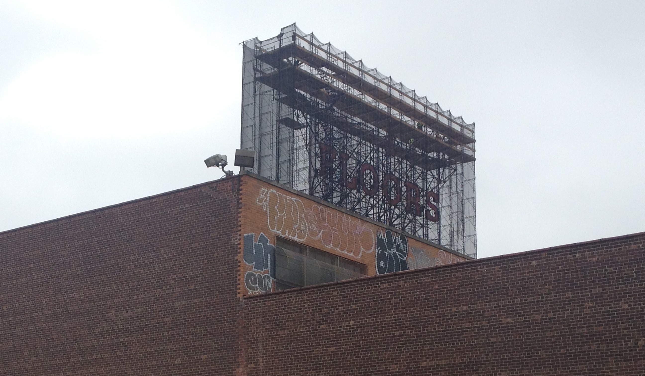 Then, at the beginning of this month, Kentile Floors rumors started flying again. More troubling was the fact that this time, the rumors were supported – by scaffolding. On June 4, Gothamist reported that scaffolding was going up around the sign, and that a permit to remove it had been quietly applied for and granted back in April.**** On June 19, despite appeals by community residents and local politicians, the “K” and “E” came down. Yesterday morning, when I ran along 9th Street on my way to the Red Hook track, all that remained of “Kentile” was the bottom half of the giant central “T.” I could barely make out two workers on a lift, doing something, slowly. Removing an 8-story sign is painstaking work.