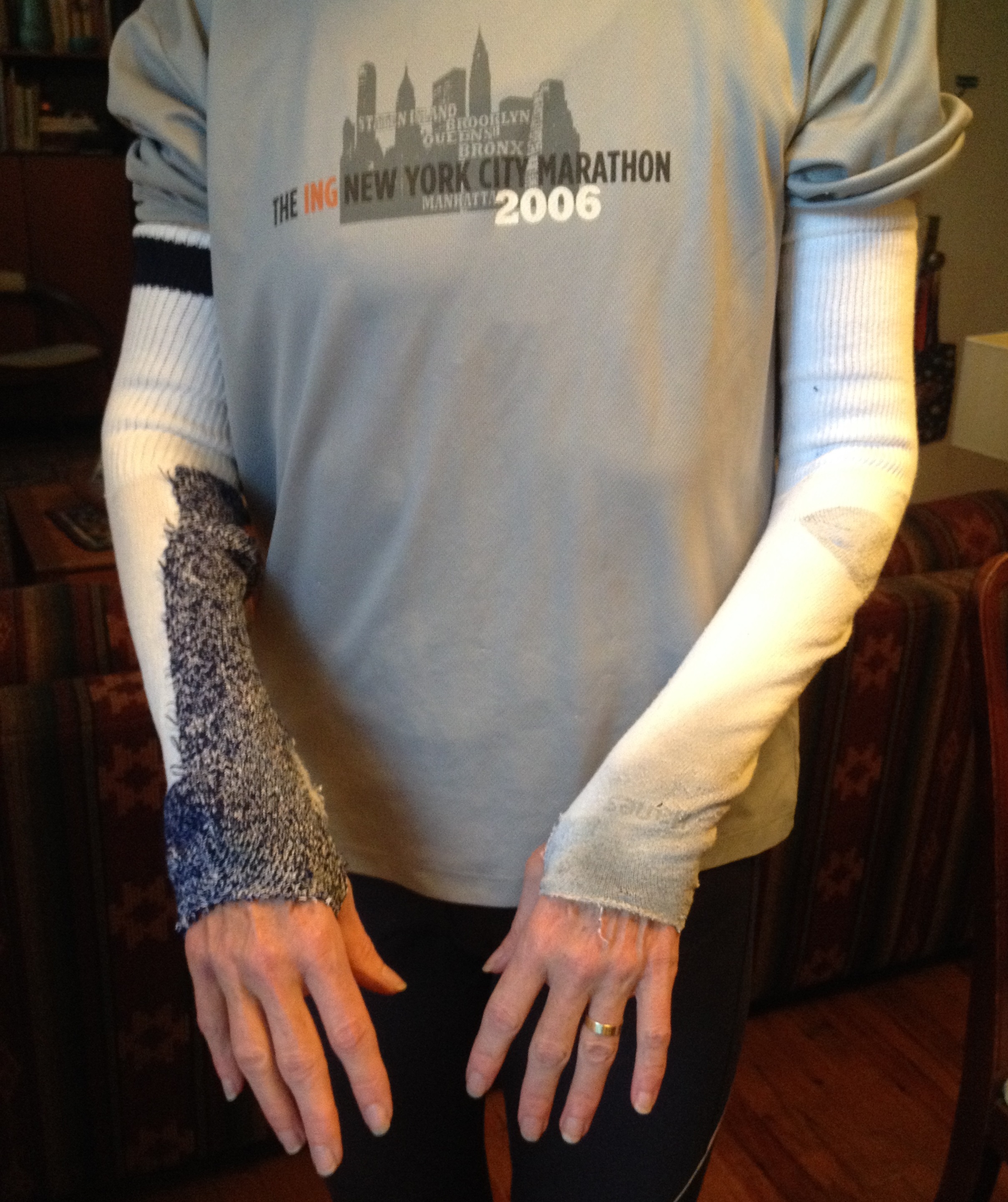 Take the attractive and highly functional arm warmers pictured here. They’re fashioned from a wonderful thing called “socks,” widely available for a few bucks a pair from your local dollar store, pharmacy or street fair (or for even less if you take them from your spouse’s sock drawer). A snip here, a snip there, and you’re in business.  I plan to wear these with my race singlet for the first few miles, then throw them to my cheering fans somewhere along Fourth Avenue.