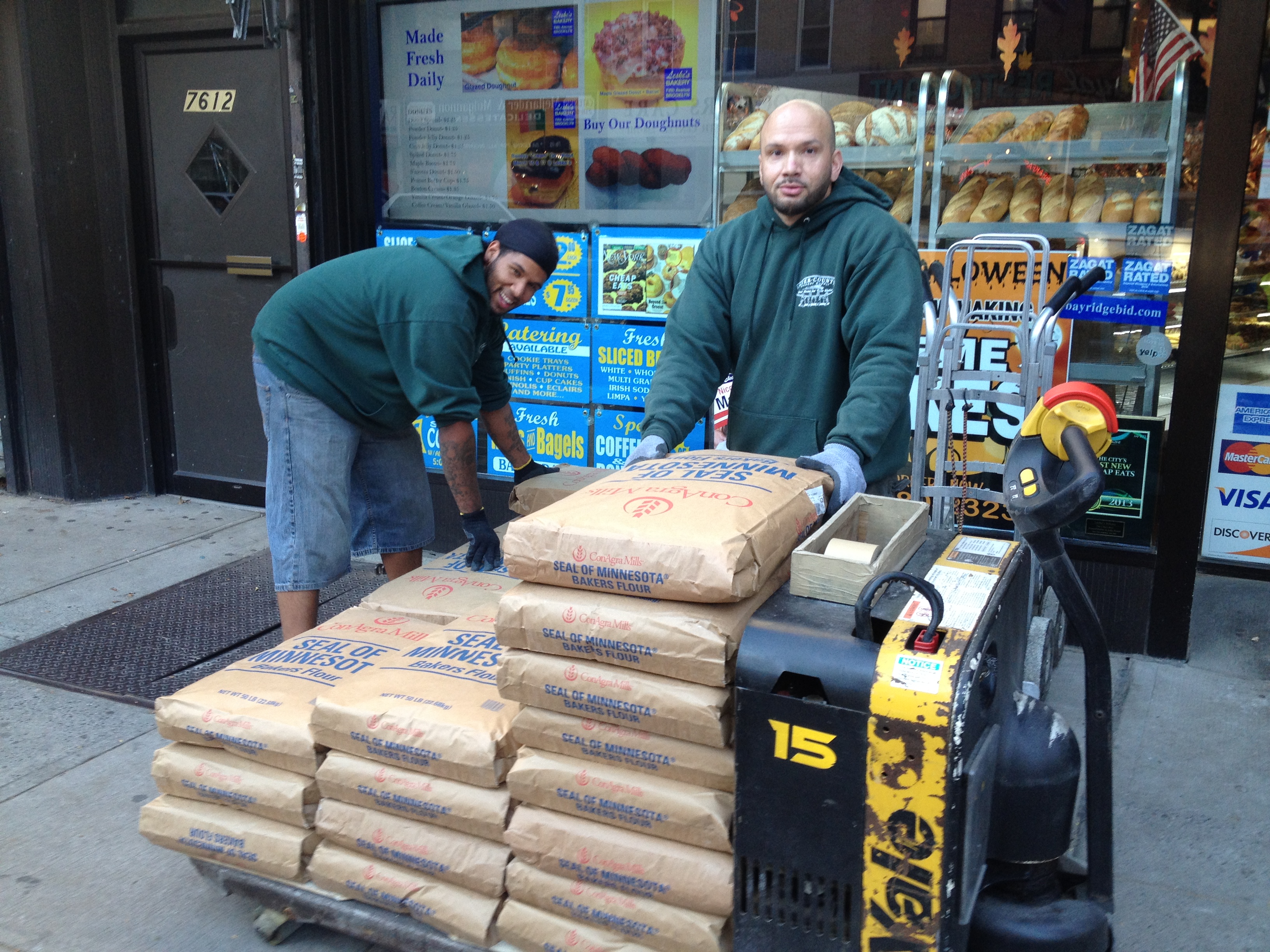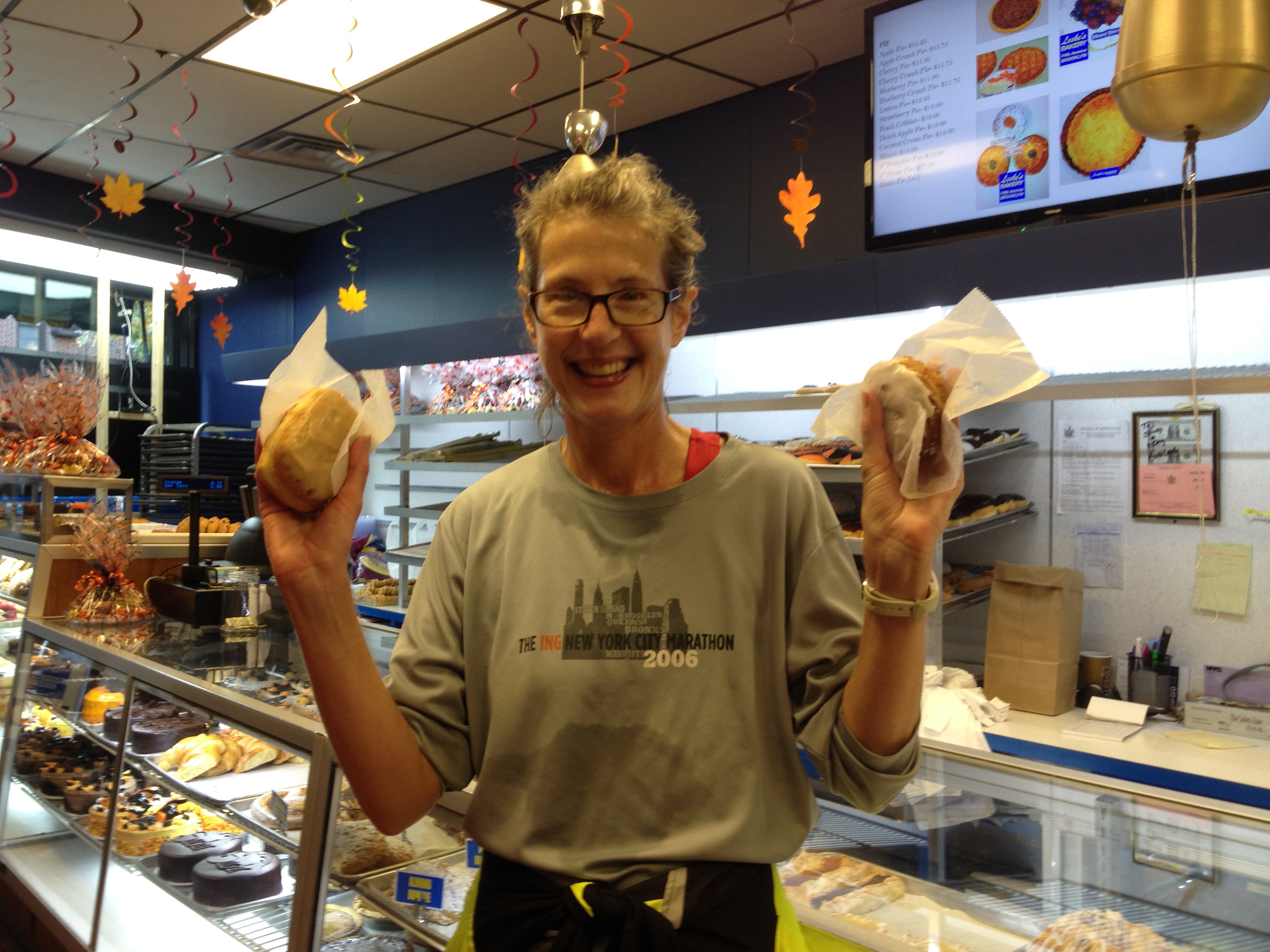 There are some gems in there, though, like 2-for-1 doughnuts at Leske’s in Bay Ridge. You won’t find doughnuts glazed with organic passion fruit icing and sprinkled with non-GMO, fair trade cocoa nibs there. You will find airy crullers and overstuffed squares oozing raspberry jelly. I planned today’s easy 5 miler so that it ended at their store, which happens to be practically on the marathon route. I arrived just as a massive shipment of flour was being delivered, and got a peek into their bakery operation in the back. Super nice people, great old school doughnuts and cheap, too (even when they’re not 2-for-1).