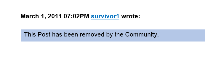 Those three years when I battled the nasties are a little foggy now, the way my chemo summer is a little foggy. When I decided to write this, I went back to the site for the first time in over a year. I knew that many of the most contentious threads wouldn’t be there – they’d been taken down by the moderators during the worst of the fighting, an ineffectual effort to keep the peace that only cheered and emboldened the nasties. Recreating conversations was well-nigh impossible because of all the pale blue bars (like the one that illustrates this post), signifying a censored or self-deleted item. In addition, when the site finally announced a crackdown on multiple user IDs, several of the nasties (along with their alter-egos) abruptly left the community and deleted all their posts (numbering in the thousands in some cases).