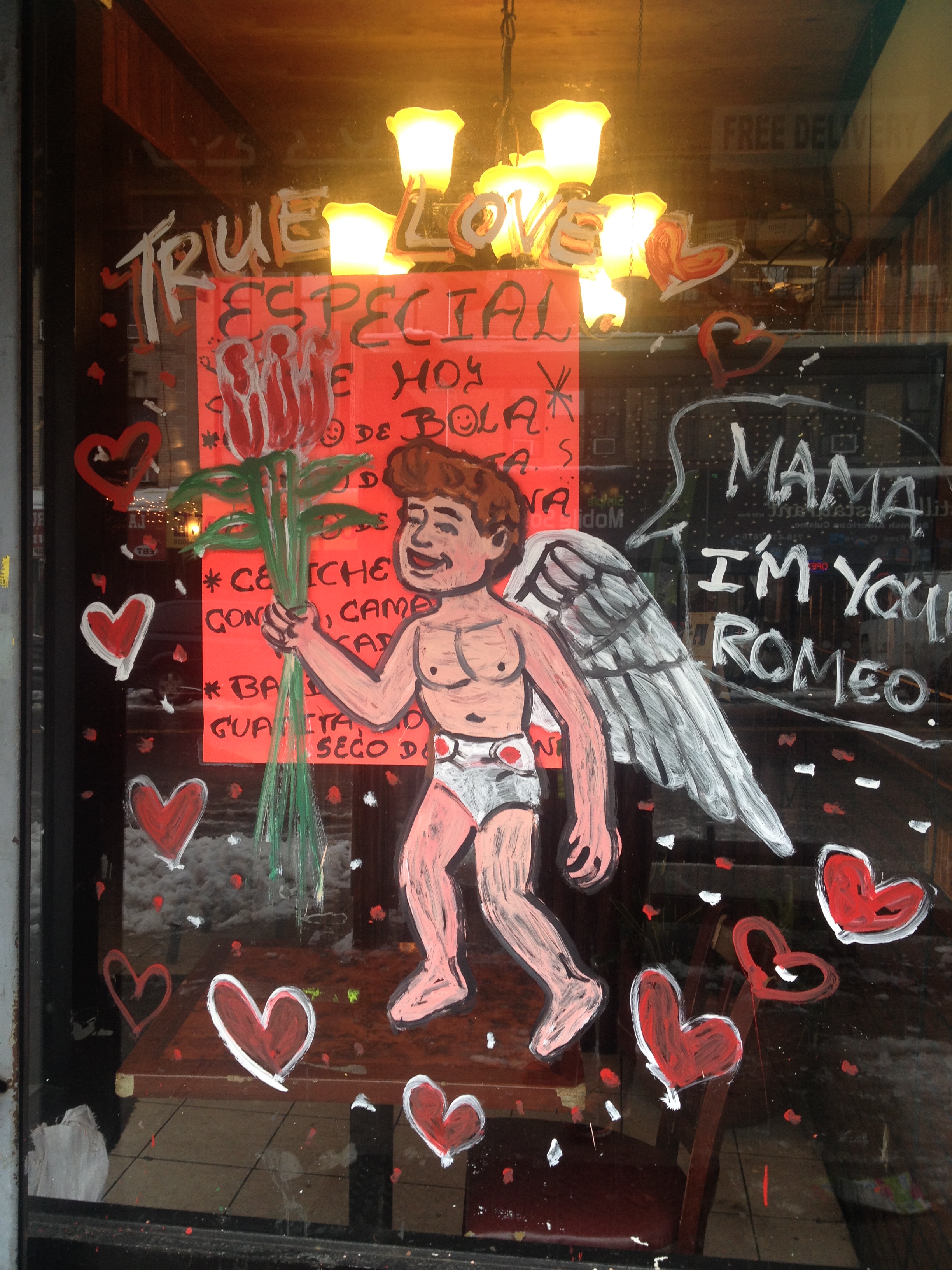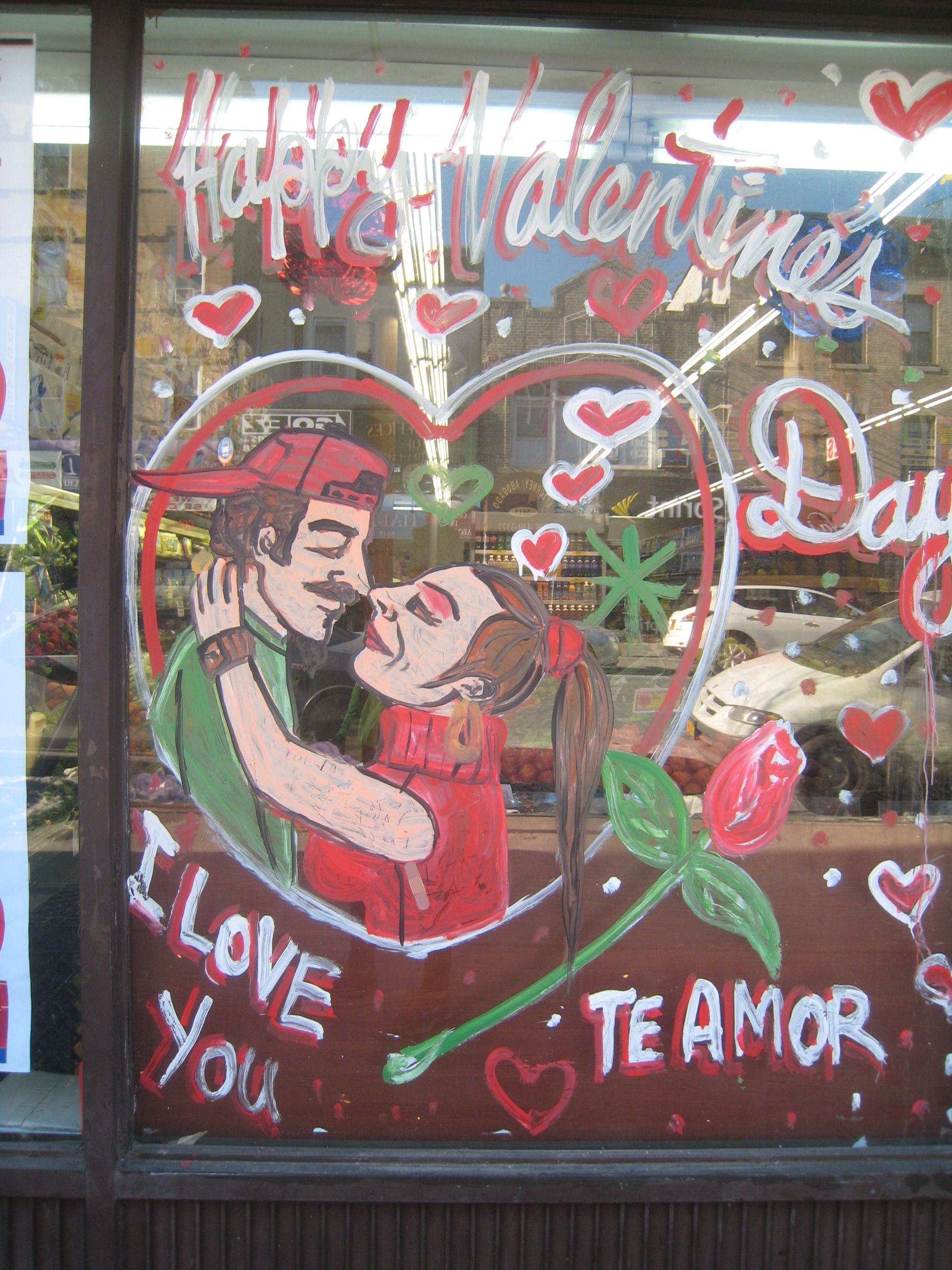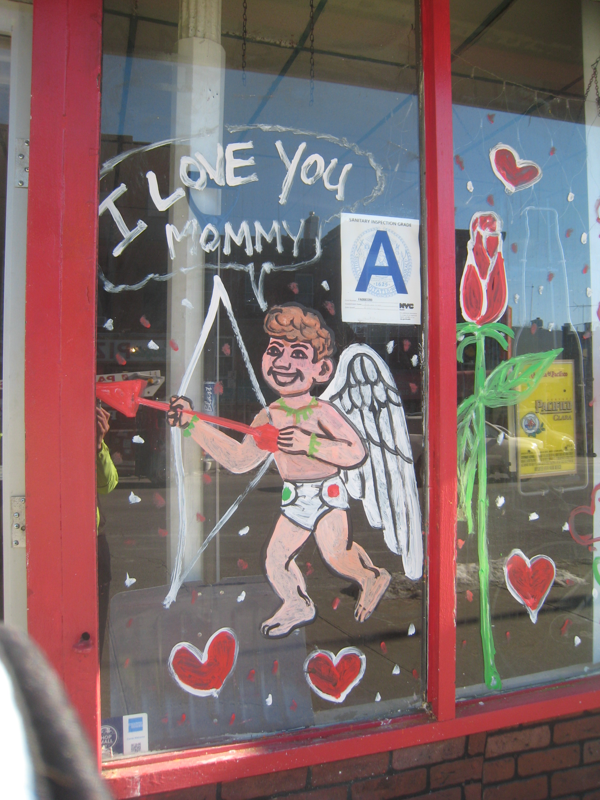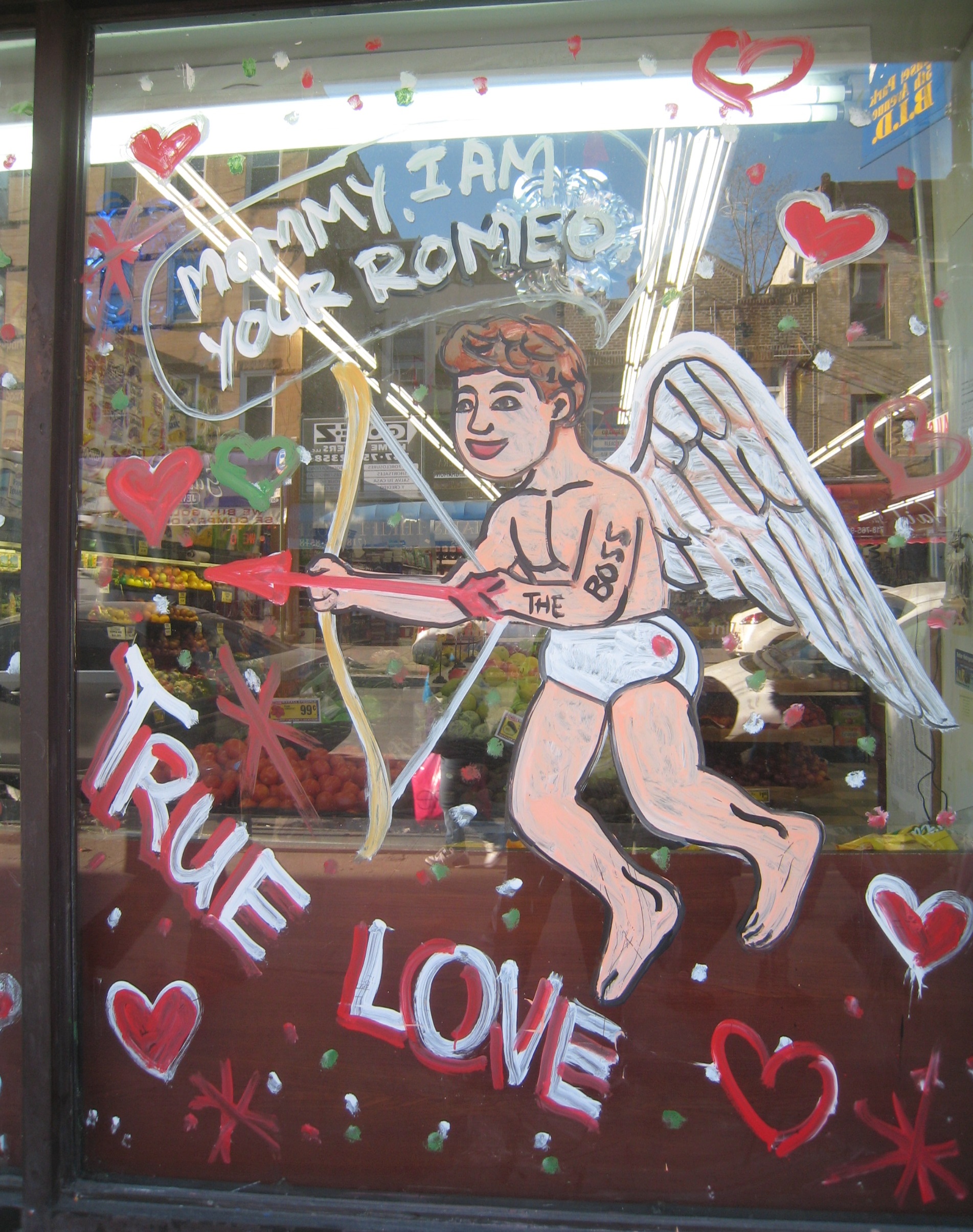 After yesterday’s text-heavy post, just pictures today. All of these images are from storefronts on 4th and 5th avenues . . . mainly in Sunset Park, but extending as far north as 4th ave and President street. I don’t know if they’re the work of the same artist, or if, over the years, certain conventions have become standard (androgynous couples embracing, Cupid in tighty-whities).