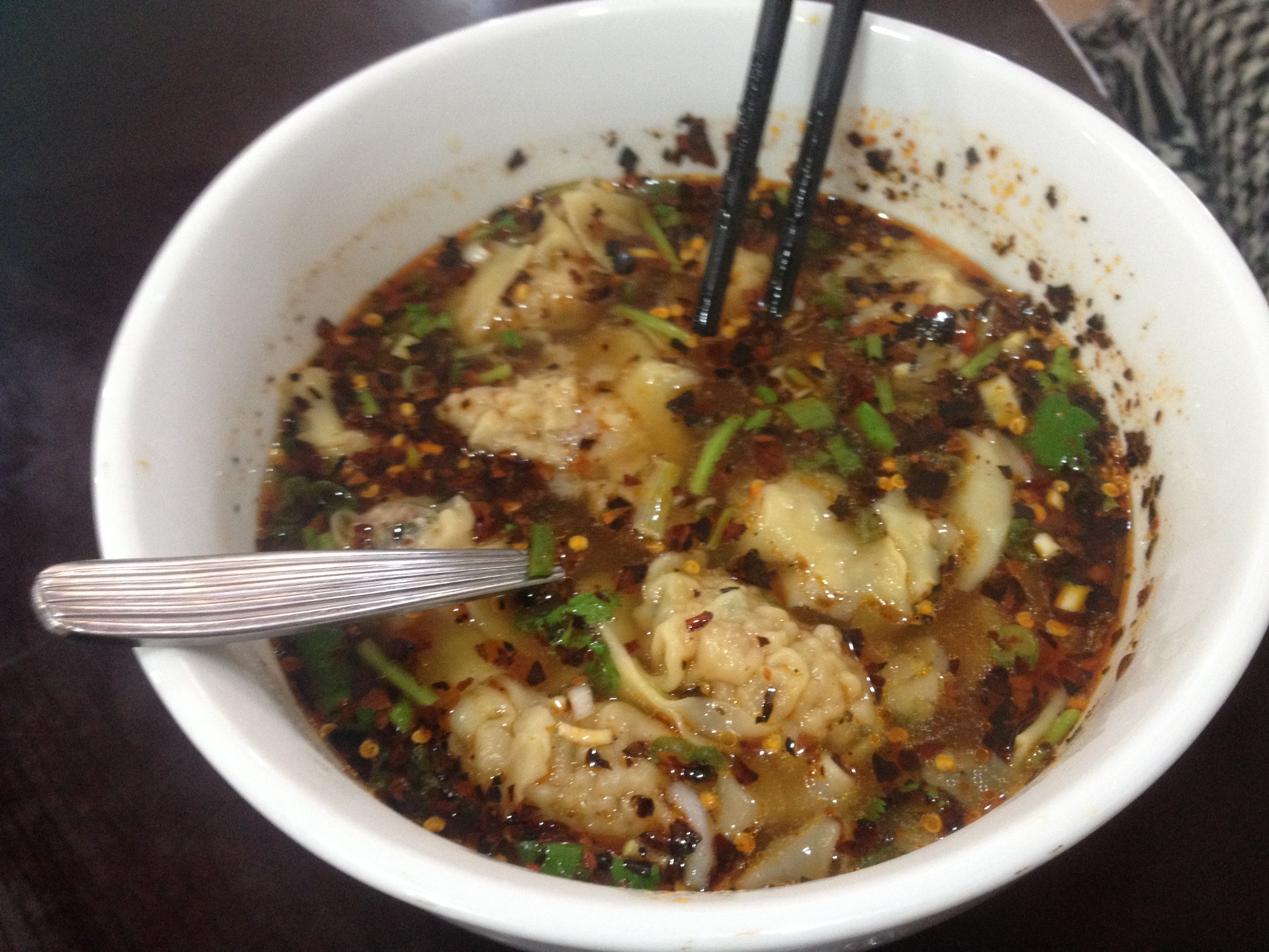 About those dumplings . . . despite the name, this is really a soup. The dumplings float in a chili-slicked broth that’s deep, tangy and sinus-clearing. It’s the soup Katie craves when it’s cold outside, when she’s sick, and when she’s far from Brooklyn. (God help her when all three are true, as was the case earlier this year.) It also brings out her poetic soul. The dumplings, she declared, remind her of petticoats: ruffled and delicate, stretched so thin they’re nearly transparent. It’s a perfect description.
