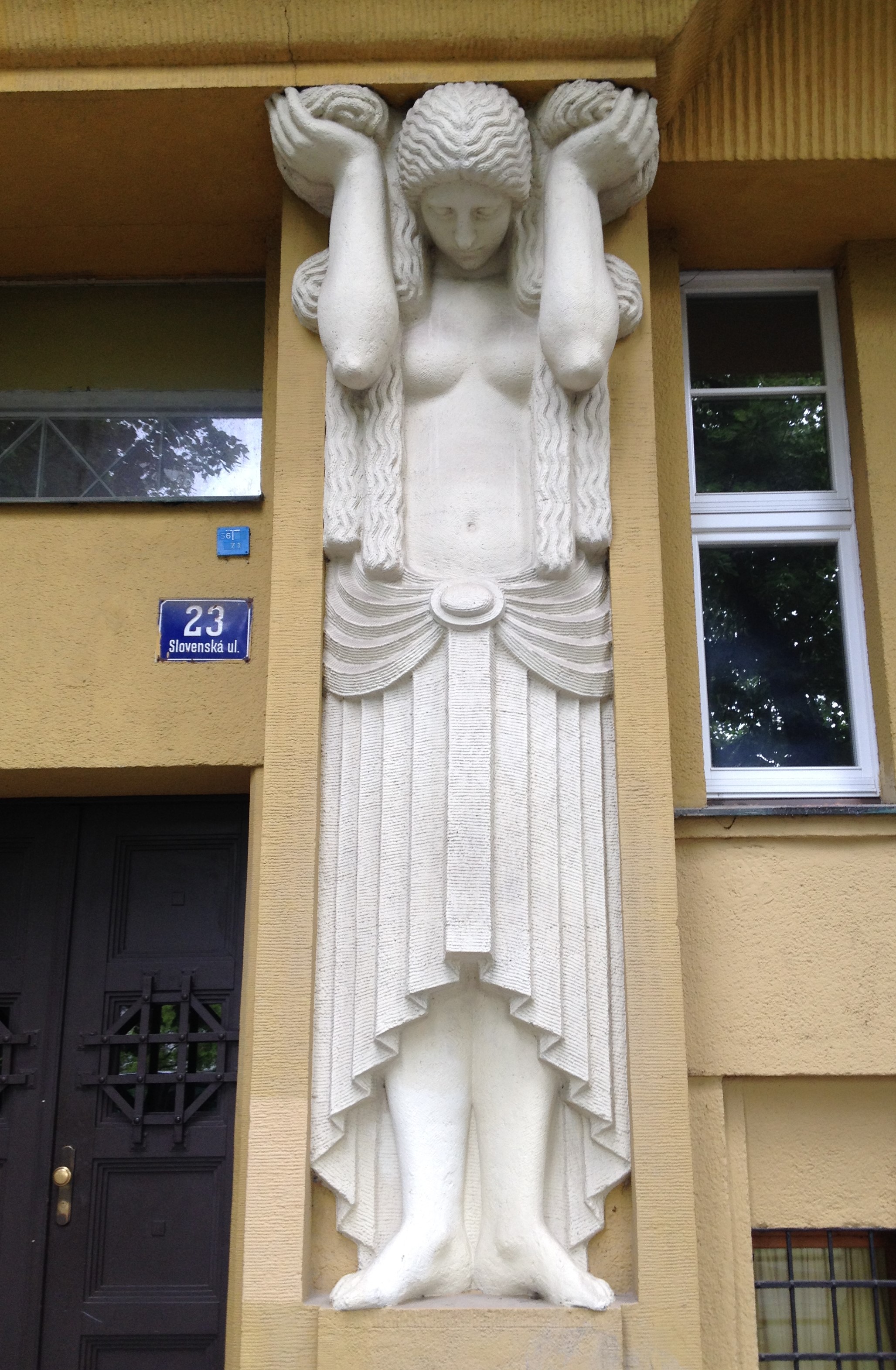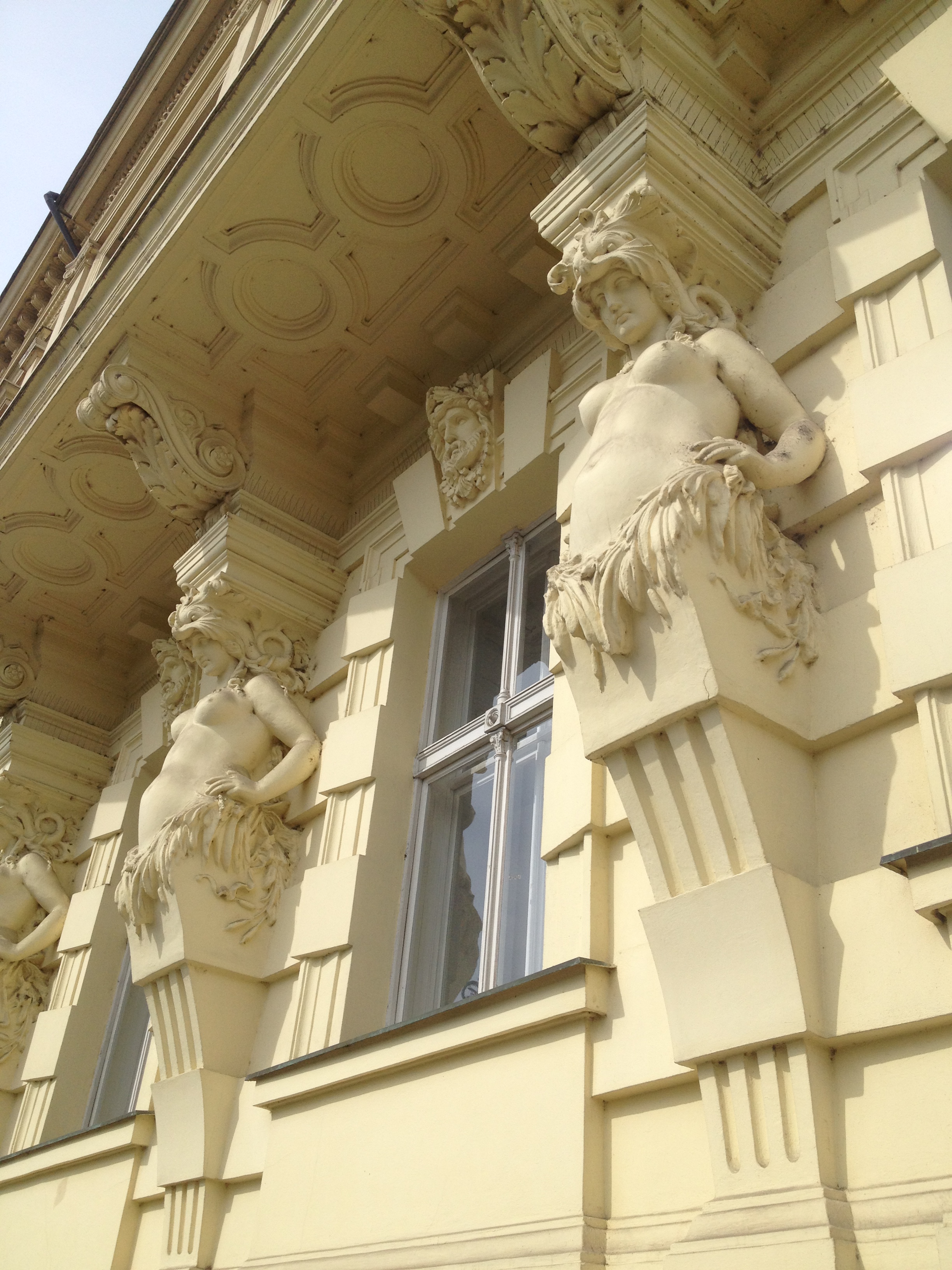 Prague has the hardest-working statuary around. The classic postcard image of Prague emphasizes red-tiled roofs and labyrinthine medieval streets. Perhaps because we spent most of our stay outside the city’s historic center, on the border of the Vršovice and Vinohrady neighborhoods, my first and most enduring image of Prague is of fine 19th and early 20th century buildings in the art nouveau style – with statues drafted into supporting roles.