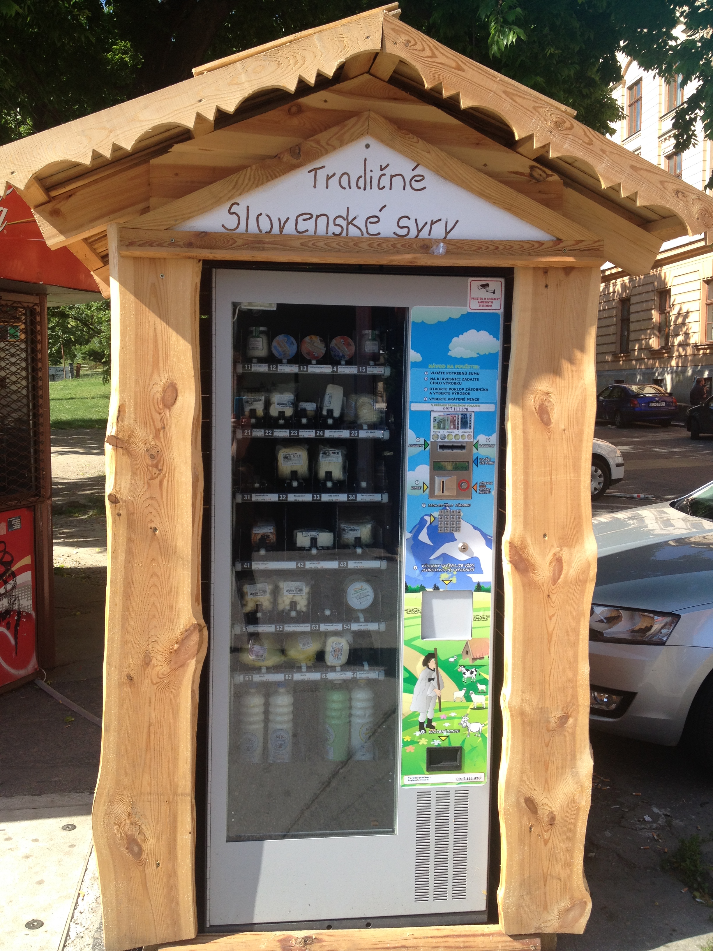 In Bratislava, you can buy cheese from vending machines. At bus stops. Although we spent most of our time in the Czech Republic, it seemed only fair to venture south and east to Slovakia for a few days. The Slovak capital, Bratislava, is a delightful city with a pedestrian old town, the aforementioned Museum of Clocks, a castle, the stunning “Blue Church” of St. Elisabeth, bike/running paths along the Danube and . . . at the Zochova bus stop, a rustic vending machine from which you can buy yogurt, the tangy sheep’s milk cheese called bryndza, and other traditional Slovak dairy products.