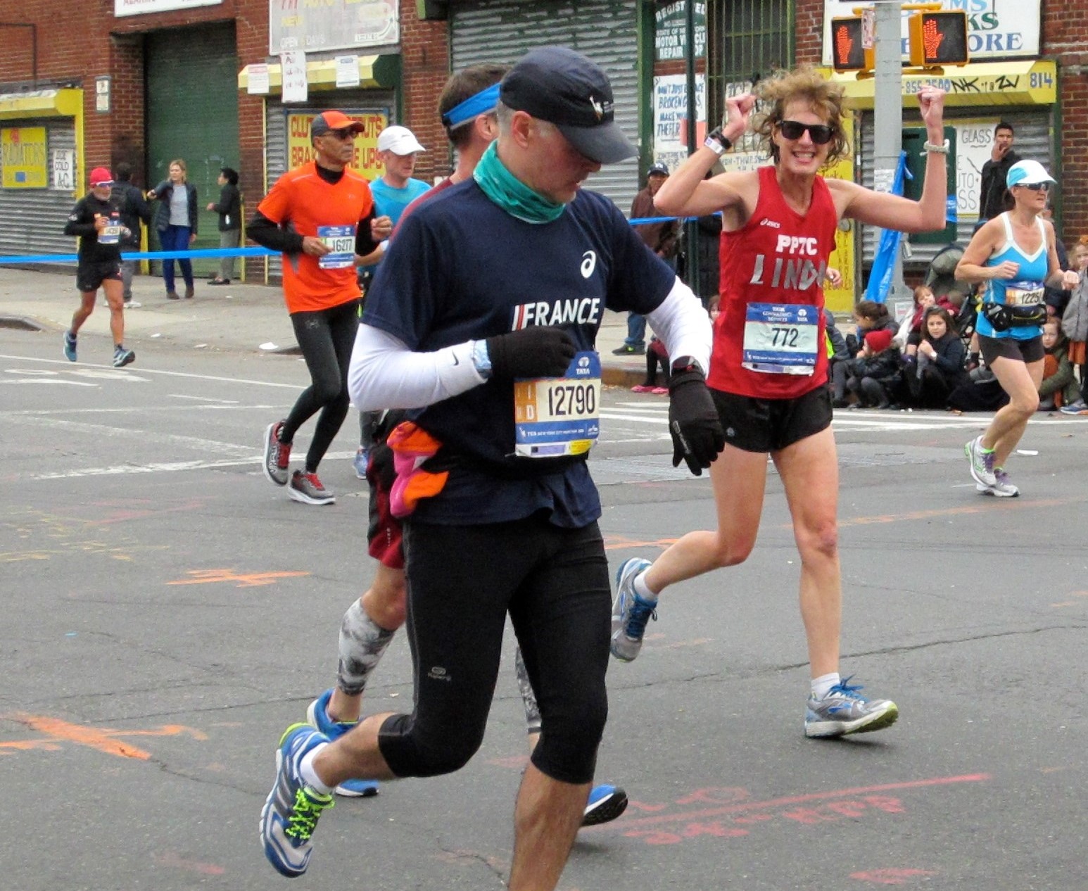 The atmosphere outside the JackRabbit store in Park Slope was festive – especially considering that it was 5:45 a.m. on a Sunday. As usual, the Prospect Park Track Club had chartered buses to take members (and nonmembers who asked nicely) to Staten Island for the marathon start. We hugged, we laughed, we wished one another luck, we compared our pre-race garb (fuzzy pajamas from DII – the greatest close-out store on earth – were popular). And then we got on board.