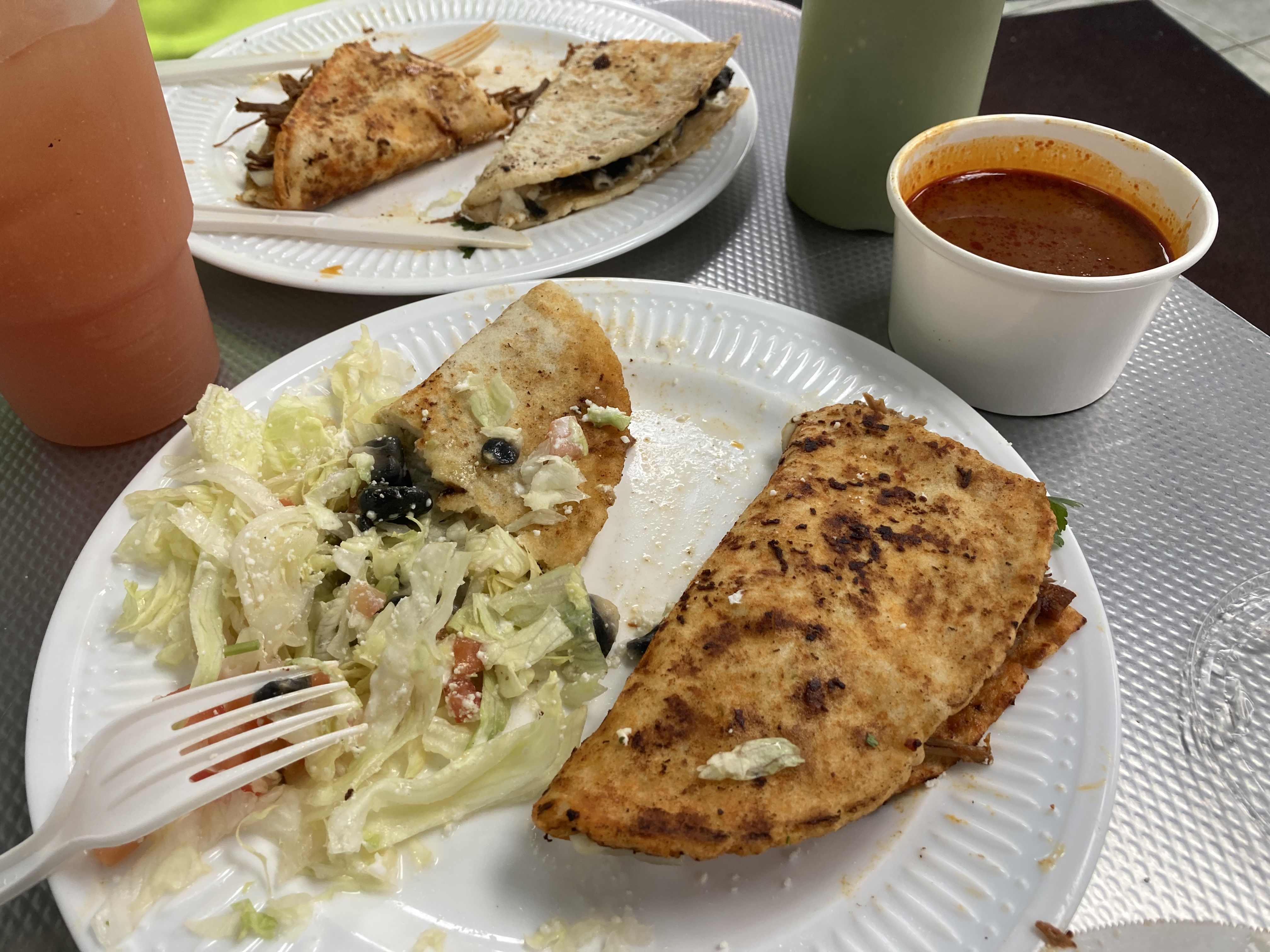 We ordered – one birria quesdailla, one de huitlachoche, because why not, plus a large agua fresca de guayaba, because the day called for a giant plastic cup of something cold and pink – and waited.