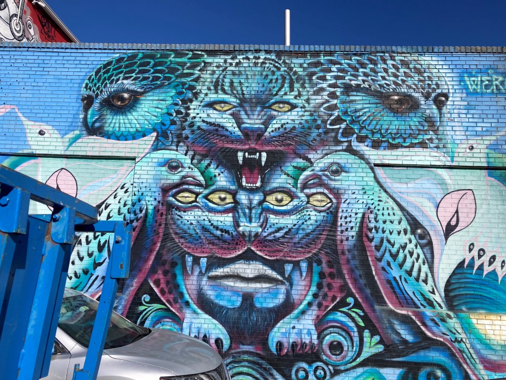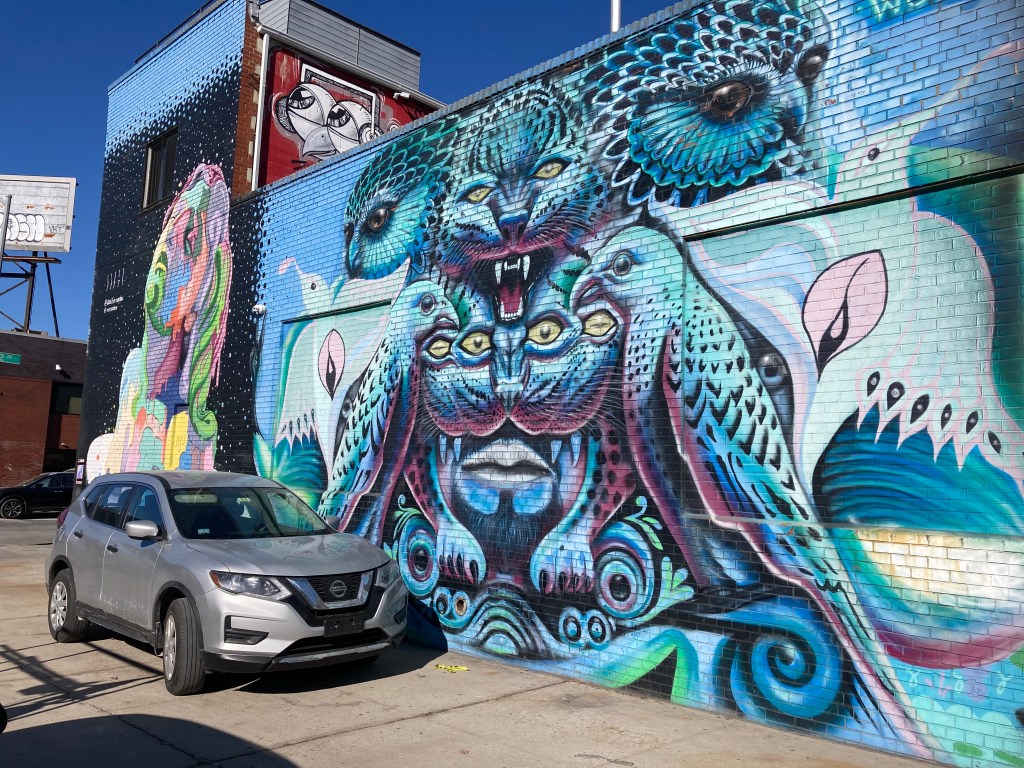 Not only is sidewalk parking problematic for pedestrians, it also blocks one’s view of cool street art, like this mural in Gowanus. I did my best, but the between the silver Nissan on the sidewalk and the truck parked curbside, it was challenging to capture everything going on in the work.
