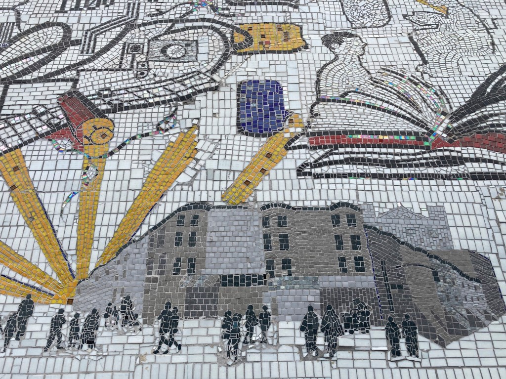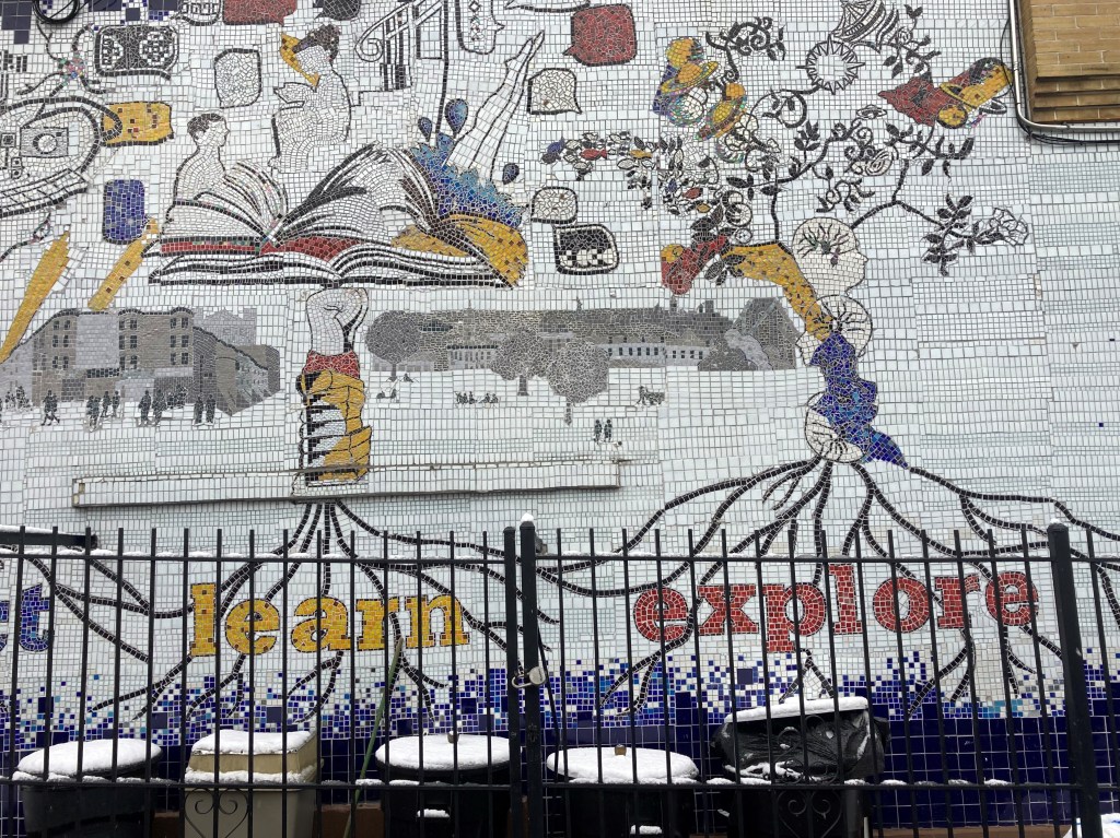 This mosaic mural (!!!) shows that officially-sanctioned art doesn’t have to be bland. It’s titled “Roots of Knowledge,” and it’s a creation of the wonderful folks at Groundswell, whose work I’ve blogged about before, in partnership with the Brooklyn Public Library.