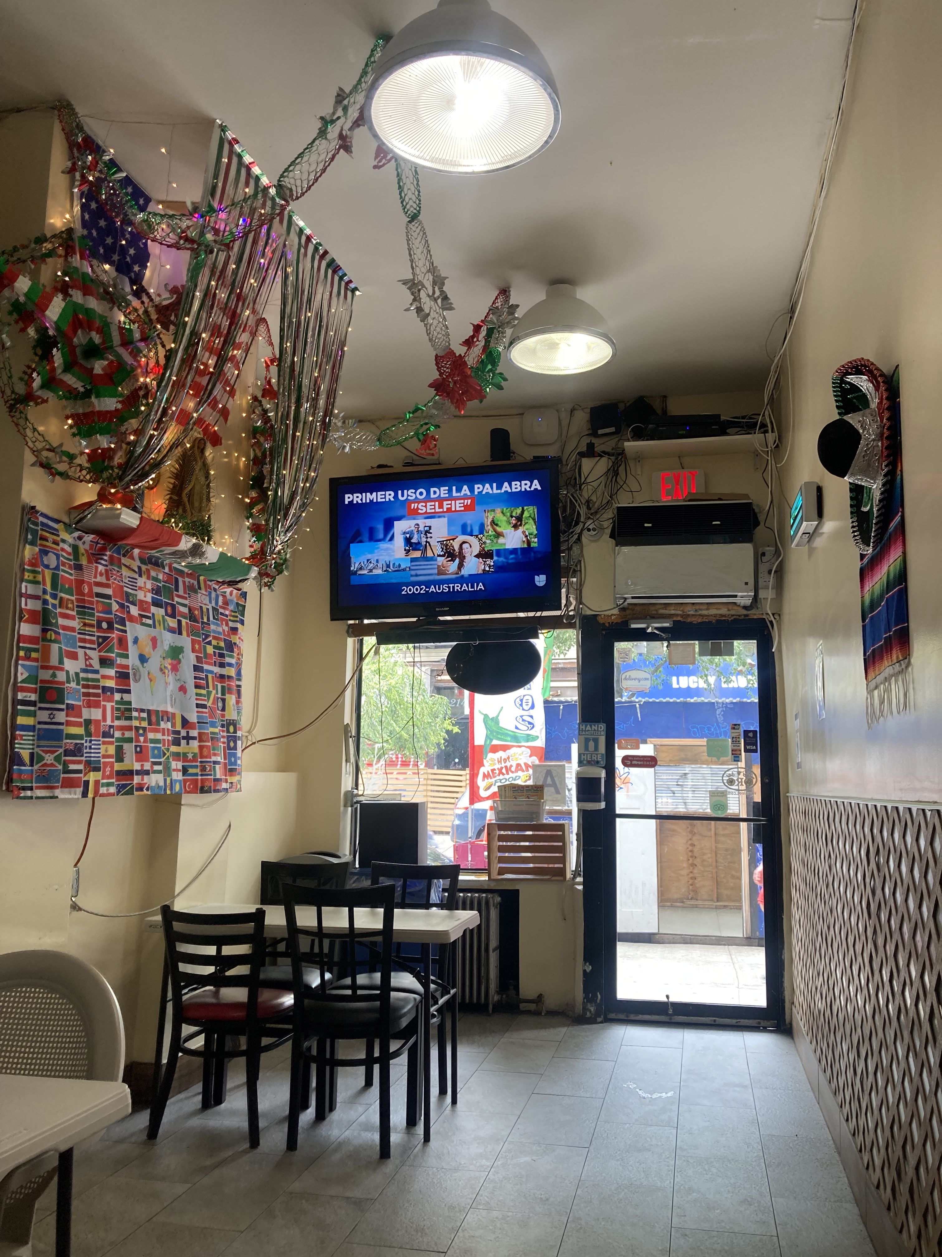 So where to go? I walked Knickerbocker Avenue, noting various Ecuadorian restaurants for future reference, and finally, desperately, ducked into a storefront whose name was hard to discern from the exuberance of its signs. Was it “Tacos Mexicanos”? “Viva Mexico”? “Free Delivery”?