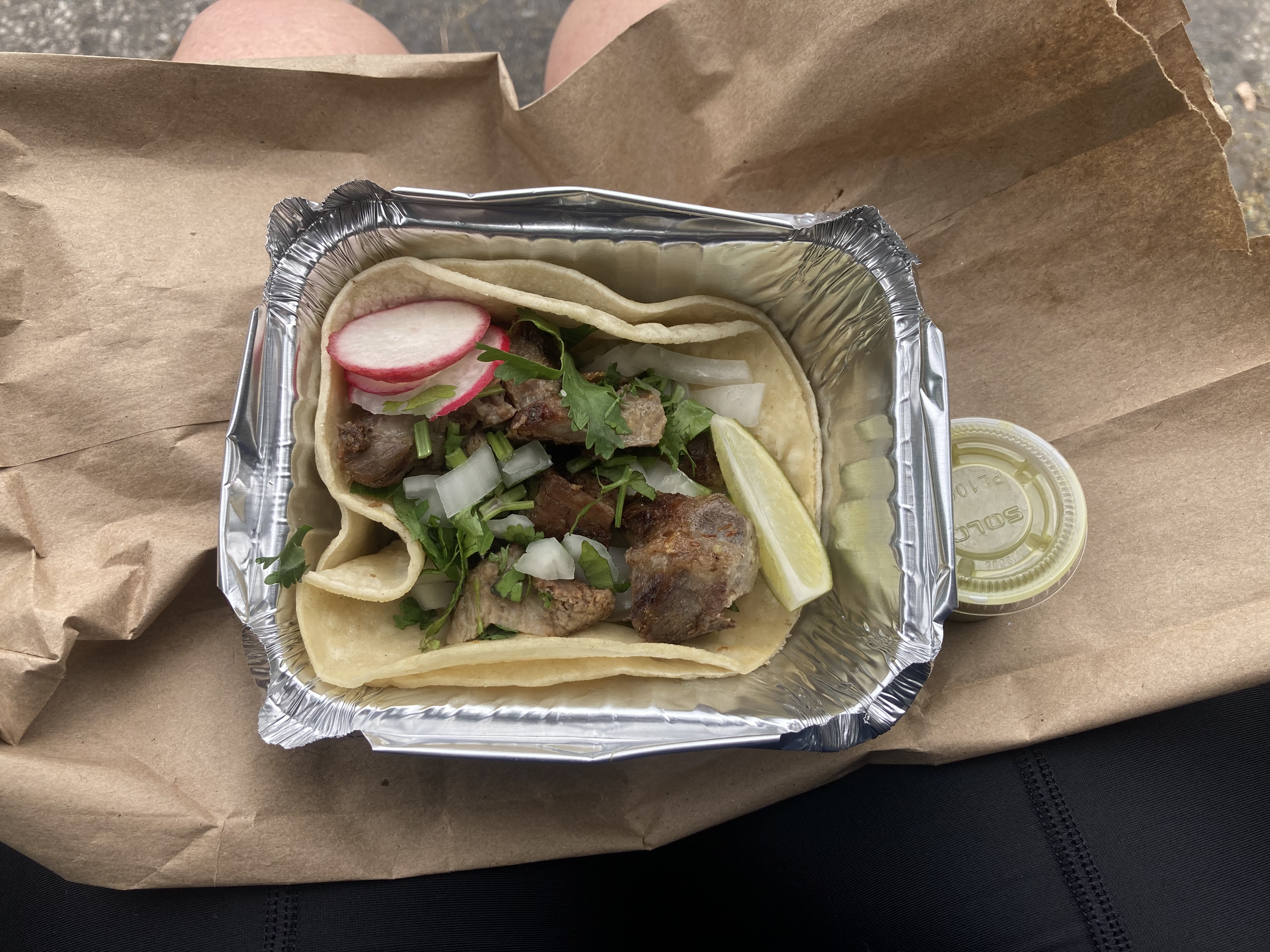 I took my taco to nearby Maria Hernandez Park, and ate it while watching the skateboarders do tricks. Despite my doubts, or perhaps because of them, it was delicious. The goat was gamy in a good way, as goat should be, and the fatty edges carried a crispy char. There was more than enough chunky meat to justify the $4.50 price tag (the reason I only ordered one).