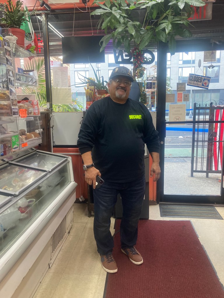 A second nonnegotiable tradition is a post-run stop at Reyes Deli, on Fourth Avenue between 14th and 15th streets. I order my ritual breakfast sandwich Toluqueño (eggs scrambled with chorizo, topped with cheese, avocado and salsa roja, and tucked into a roll that’s neither too squishy nor too crusty), then hang out and chat with the other customers, a mix of regulars, marathon fans, cops working the event, and Reyes’ own director of marathon security, whose Monday-Friday job is in building maintenance. Come inside with me – there’s time, the wheelers are just starting to go by and the first runners won’t be arriving for another 45 minutes – and check out the scene.