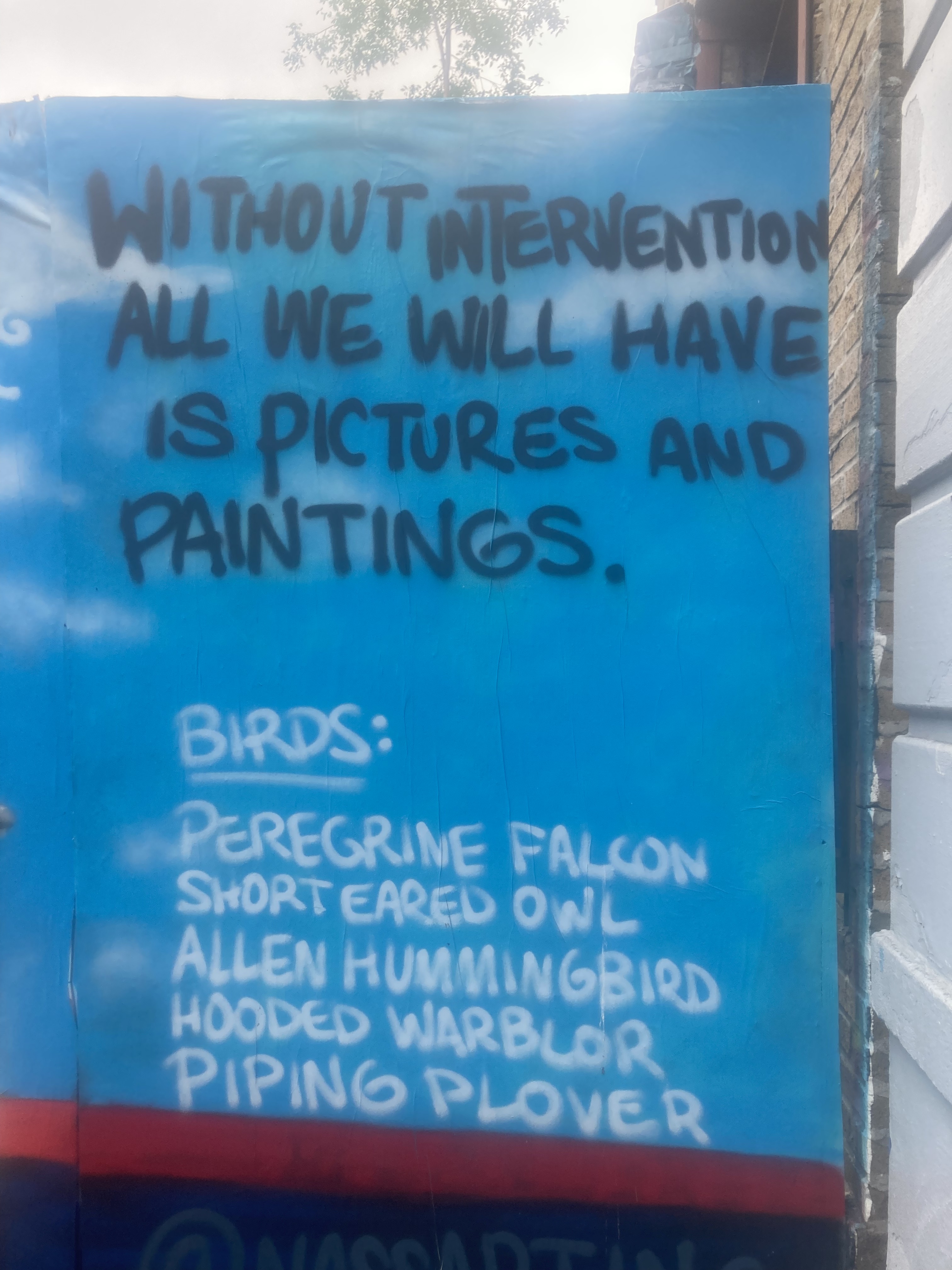 And what should greet me, as I turned the corner on my Citibike, but a Hooded Warbler, one of my favorite birds. Was that a Piping Plover beneath it, seemingly unfazed by a Peregrine Falcon? And a Short-eared Owl gliding from one panel to the next? Yes, yes, and yes.