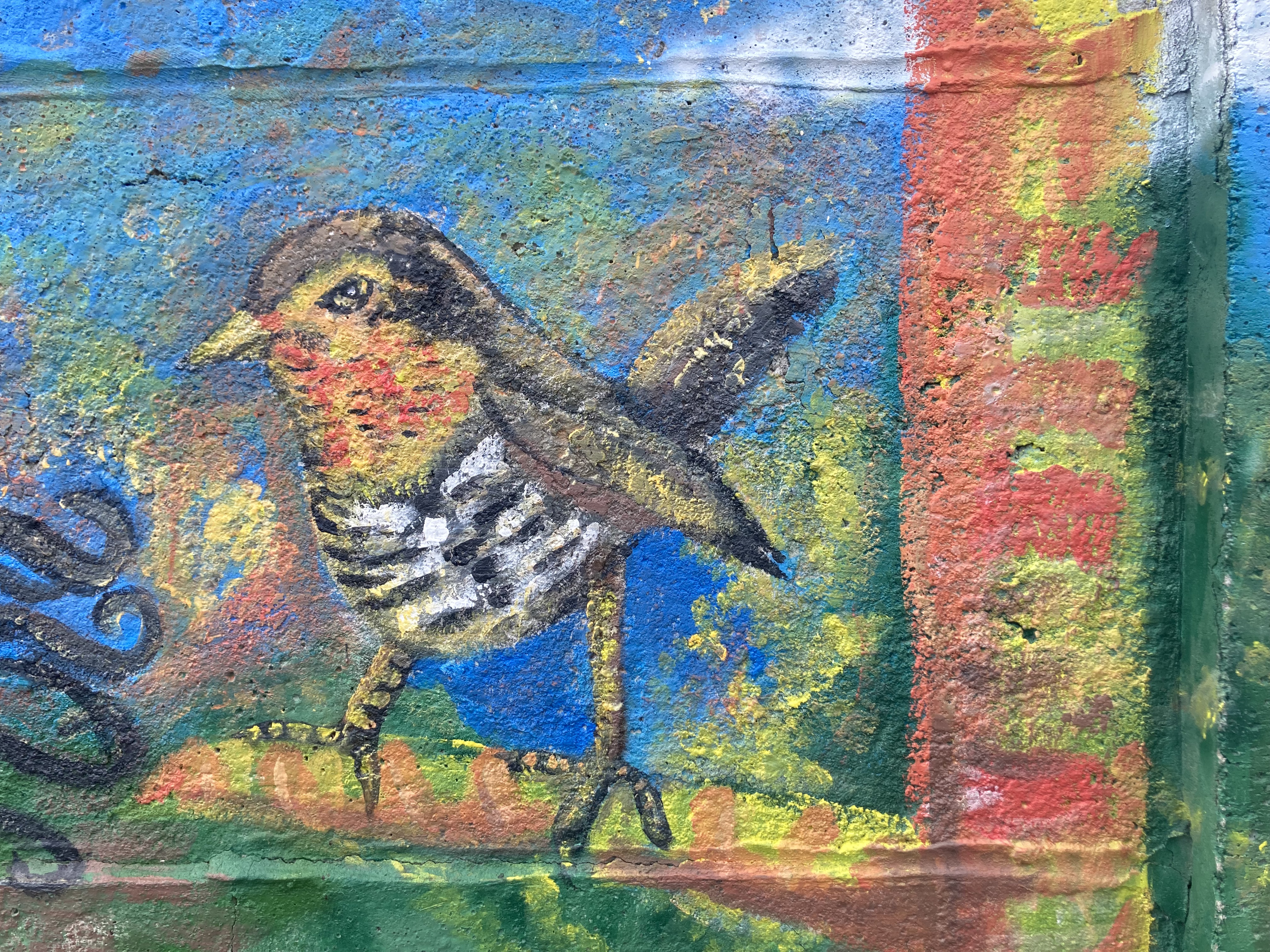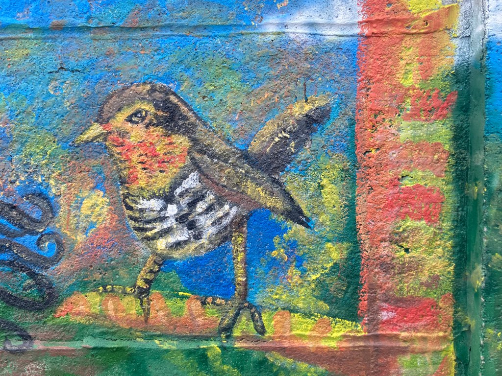 Sometimes street art birds are as frustratingly elusive as their real-life counterparts. I’m not talking about fantastical, imaginary birds, their bright colors and extravagant tails serving as metaphors for beauty and freedom, but birds that appear to be closely-observed and painted from life. For example: what am I looking at above? Its general shape and preference for deep cover suggest a tapaculo of some sort, and the brown cap and white eyebrow and throat are good for a White-throated Tapaculo. So is the bamboo, if indeed those are bamboo stalks in the background. But White-throated Tapaculos don’t have white eye rings, and they prefer dry, rocky scrub to the kind of damp, mushroomy, sprite-filled forest depicted in this mural.